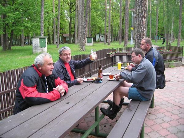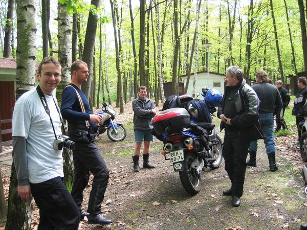 Tak nakonec vše (včetně počasí) vyšlo, sjeli jsme se v kempíku Hluboký za Holicemi a takovou účast na našich spíše komorních akcích nepamatujeme. Již v pátek dorazil jako předvoj Jirka L., od rána zajišťovali příjezd Marek s Milanem. Plzeňská část nabrala cestou ve Voticích Jirku a dorazila kolem jedenácté. Do půl jedné se sjelo celkem 20 motorek, z toho 13 pegas. Pravda, ne všichni absolvovali sobotní odpolední vyjížďku celou, ale při pohledu na masu strojů jsme začali uvažovat o potřebě regulovčíků na křižovatkách... Nakonec výborná trasa (trochu pozměněná oproti plánu) byla navržena tak, abychom se vyhli frekventovaným místům a hlavní silnice křižovali co nejméně - což i skvělě vyšlo.