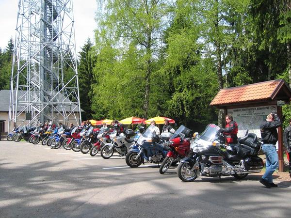 Kemp Po zapsání kontaktních detailů nově příchozích "Pegasistů" (milým překvapením byla Jana na svém modrém okřídlenci, třeba časem přemluví i svou rodinnou polovičku, zatím sedlající krásného Transalpa, na tu správnou značku...) a občerstvení jsme vyrazili po plánované trase na rozhlednu Andrlův Chlum. Tady jsme se hromadně vyfotili a ti chrabřejší na rozhlednu skutečně vylezli.